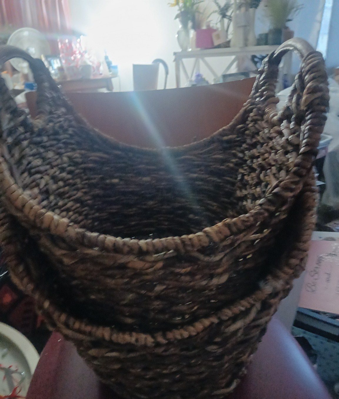 Two beautifully designed wicker baskets . Sturdy an be used as storage or decor. Stands about 12 in high very deep to hold blankets etc